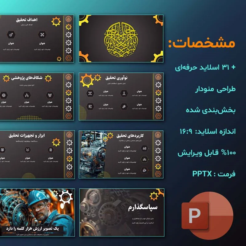 این قالب پاورپوینت با طراحی مدرن، حرفهای و الهام گرفته از چرخدندهها و المانهای صنعتی مکانیک ساخته شده است. ترکیب رنگ مشکی، خاکستری تیره و نارنجی علاوه بر ایجاد حس تخصصی و فنی، جذابیت بصری بالایی برای مخاطب دارد. استفاده از آیکونها، نمودارها و دیاگرامهای مهندسی باعث شده این قالب دقیقاً متناسب با فضای علمی و پژوهشی رشته مکانیک باشد. جلوههای تصویری و ساختار منظم آن، باعث میشود ارائه شما حرفهایتر و تأثیرگذارتر به نظر برسد.