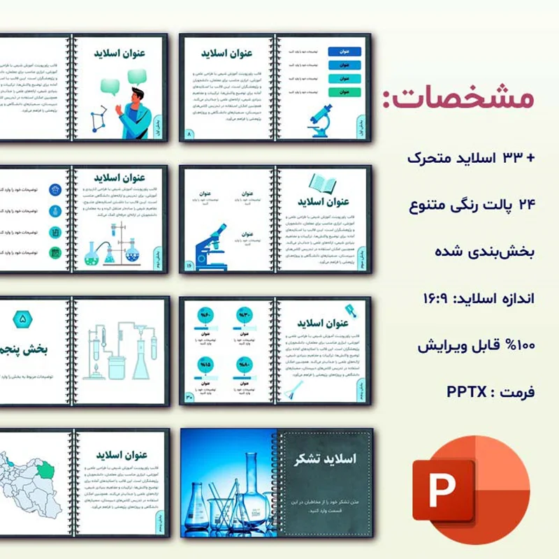 طراحی این قالب بر اساس دفترچه یادداشت علمی انجام شده است. استفاده از قابهای حاشیهای و چینش متقارن اسلایدها، حس منظم و آموزشی را به مخاطب منتقل میکند. رنگبندی قالب شامل طیف سبزآبی، فیروزهای و آبی نفتی است که جلوهای علمی و مدرن ایجاد کرده و متناسب با موضوع شیمی و علوم پایه است. همچنین با قابلیت تغییر رنگ سریع، میتوانید رنگبندی را مطابق سلیقه یا هویت بصری برند آموزشی خود تنظیم کنید.