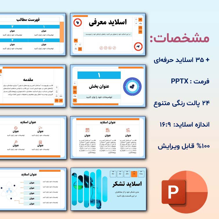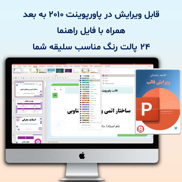 - طراحی شده با 24 پالت رنگی پیشفرض پاورپوینت برای تغییر سریع رنگبندی