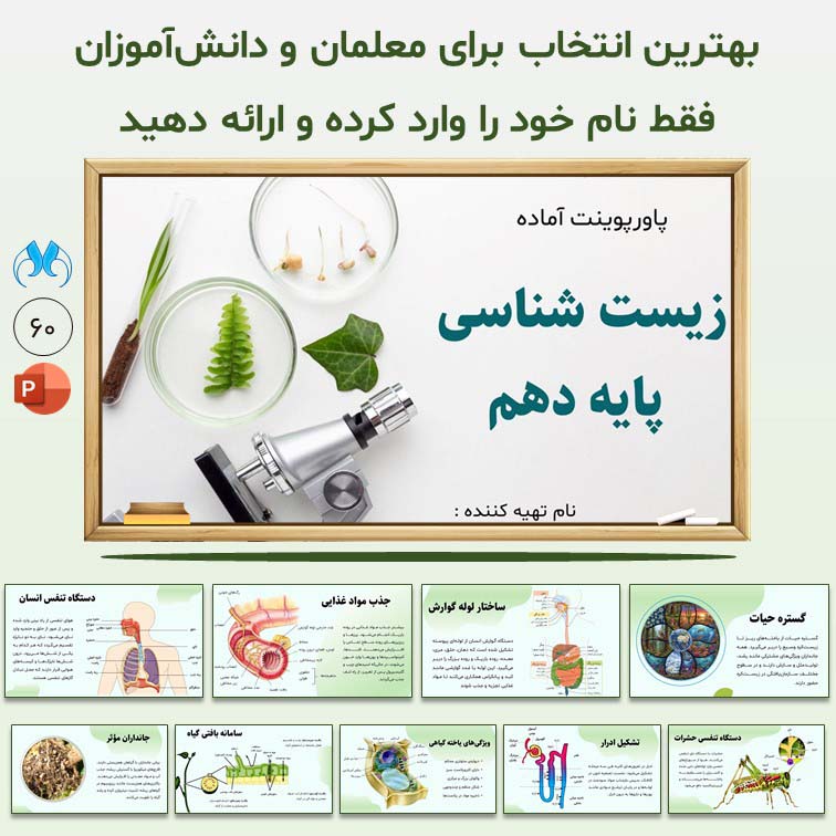 پاورپوینت زیستشناسی پایه دهم در ۶۰ اسلاید کامل و حرفهای طراحی شده و خلاصهای از مباحث مهم کتاب درسی زیست دهم را در بر دارد.