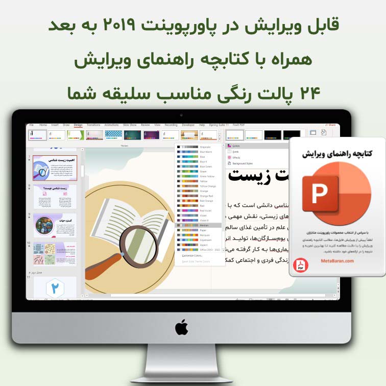 - قابلیت تغییر رنگبندی تنها با چند کلیک، با استفاده از ۲۴ پالت رنگی پیشفرض پاورپوینت