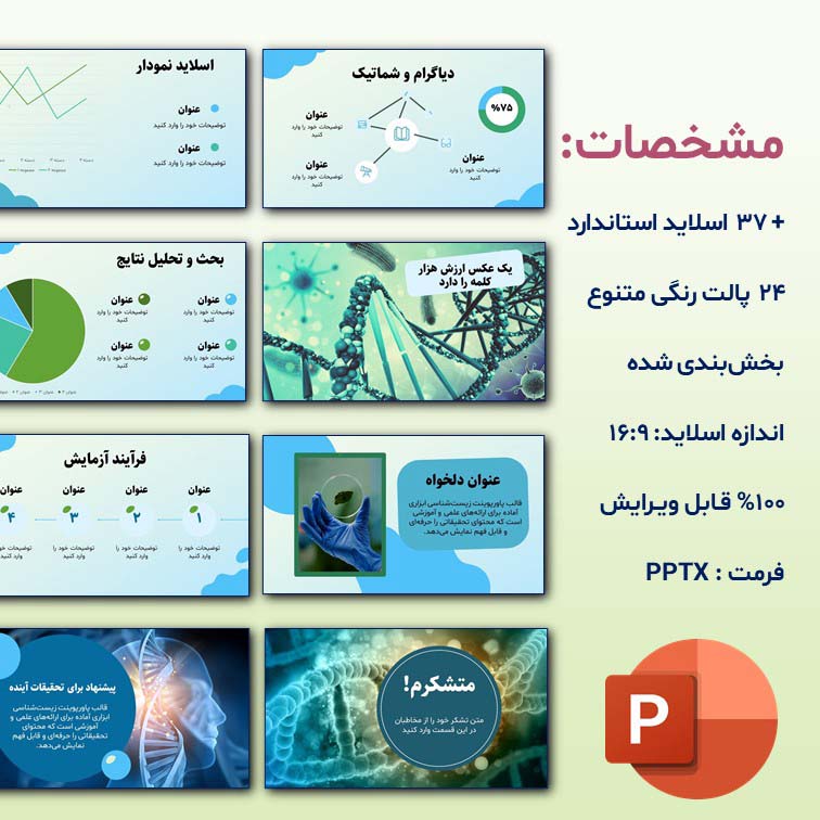 این قالب با استفاده از ترکیب رنگهای آبی، سبز و سفید طراحی شده که یادآور علم، پاکیزگی و طبیعت است. پسزمینههای نرم با المانهای گرافیکی زیستی (DNA، میکروسکوپ، سلولها و نمودارهای علمی) باعث میشود محتوای شما علمیتر و جذابتر دیده شود. سبک طراحی ساده و مدرن این قالب باعث شده ارائهها هم برای محیطهای آکادمیک و هم برای تحقیقات حرفهای مناسب باشند.