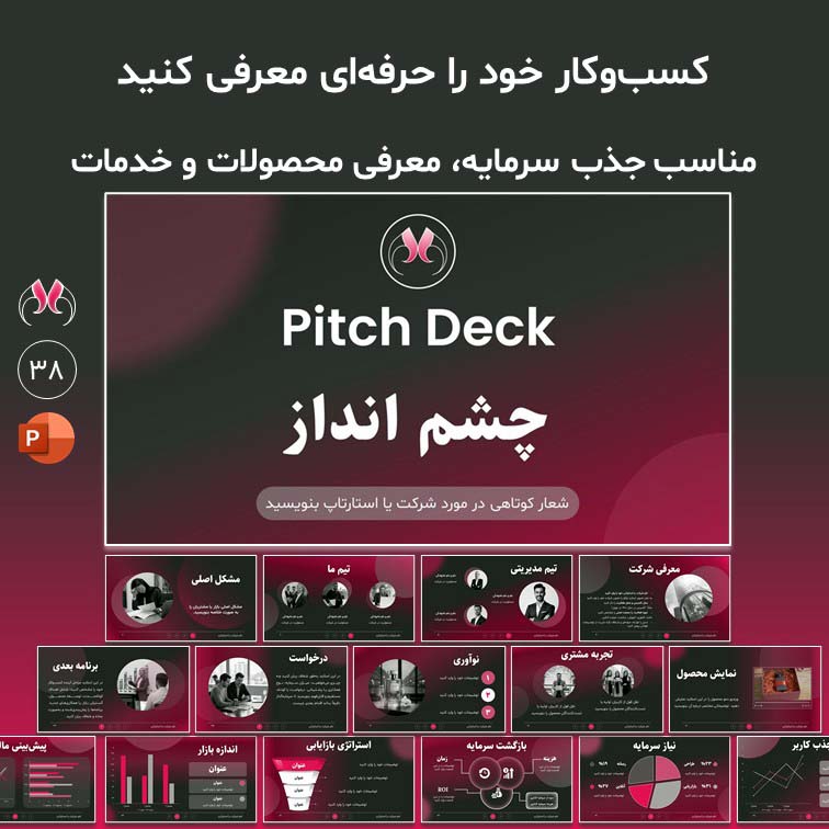 قالب پاورپوینت Pitch Deck چشمانداز یک انتخاب حرفهای برای ارائههای استارتاپی و شرکتی است. این قالب آماده با ۳۸ اسلاید استاندارد و منودار، طراحی مدرن و اینفوگرافیک جذاب، به شما کمک میکند ایدهها و محصولات خود را به بهترین شکل معرفی کنید. تم پاورپوینت چشمانداز کاملاً قابل ویرایش است و با چند کلیک میتوانید رنگبندی آن را متناسب با هویت برند خود تغییر دهید. دانلود قالب پاورپوینت چشمانداز مناسب جذب سرمایه، معرفی کسبوکار و ارائه دانشگاهی بوده و همراه با فایل راهنما، بانک آیکون و فونتهای فارسی ارائه میشود.برای دریافت این قالب:ابتدا در سایت متاباران ثبتنام کنید.روی دکمه «افزودن به سبد خرید» کلیک کنید و مراحل ثبت سفارش را کامل کنید.پس از ثبت سفارش، فایل محصول را از قسمت «دانلود فایلها» در پنل کاربری خود دریافت کنید. این فایل برای همیشه در پنل شما باقی میماند و در هر زمان قابل دانلود است. توضیحات بیشتر و ویدیوی این قالب را در پایین صفحه مشاهده کنید.
