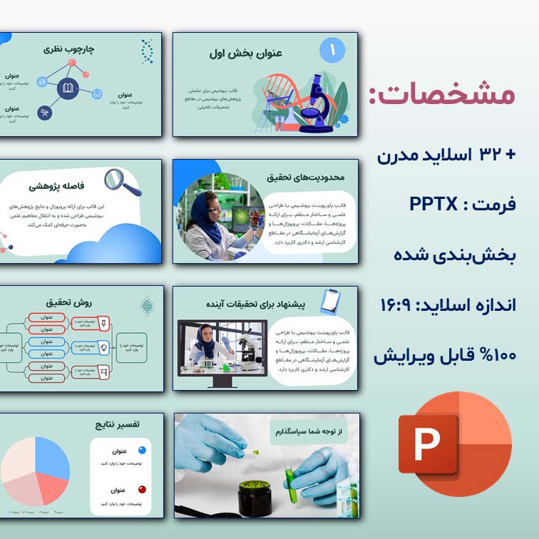 - دارای اسلایدهای تخصصی برای: عنوان تحقیق، بیان مسئله، هدف پژوهش، روش تحقیق، ابزار آزمایشگاهی، نتایج و تحلیل دادهها، و نتیجهگیری