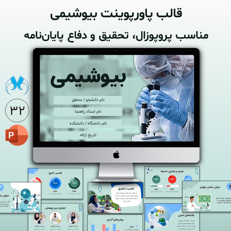 با استفاده از این قالب میتوانید نتایج تحقیق، روشهای آزمایشگاهی، دادههای آماری و مباحث تئوری بیوشیمی را به شکلی جذاب و خوانا نمایش دهید.
