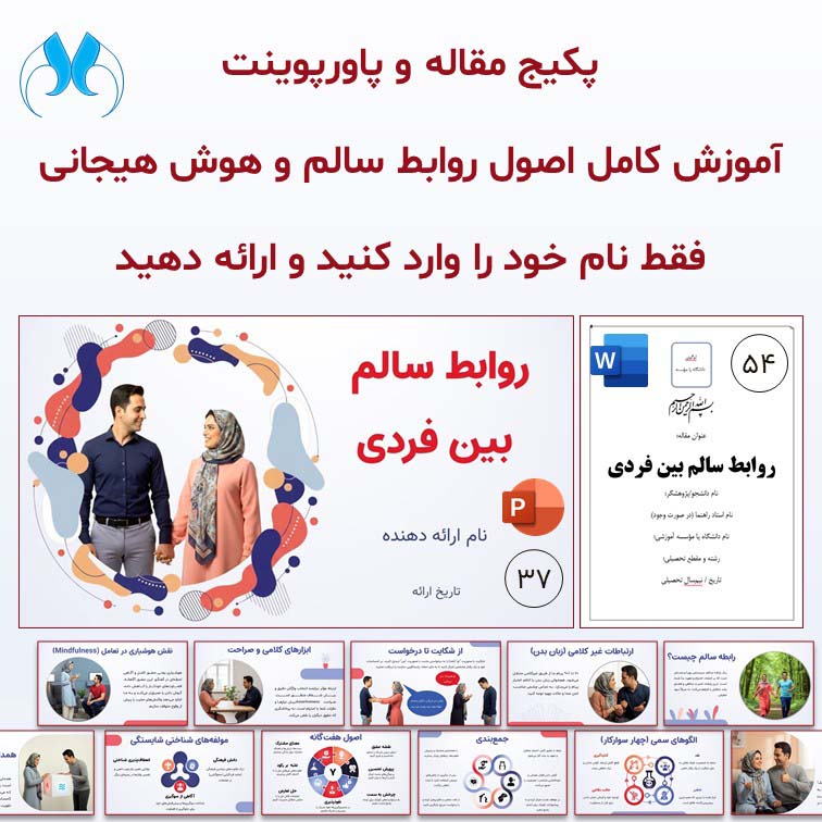 آیا به دنبال ابزاری کامل، علمی و آماده برای تحقیق دانشجویی، تدریس در کلاس یا برگزاری کارگاههای مهارتهای ارتباطی هستید؟ پکیج جامع "روابط سالم بین فردی" یک مرجع تخصصی و حرفهای است که شامل یک مقاله 54 صفحهای (Word) و یک پاورپوینت ۳۷ اسلایدی (PPTX) بر اساس معتبرترین اصول روانشناسی (به ویژه اصول جان گاتمن و هوش هیجانی) است. با دانلود این پکیج دوگانه، دیگر نگران تولید محتوا و طراحی گرافیکی نخواهید بود.