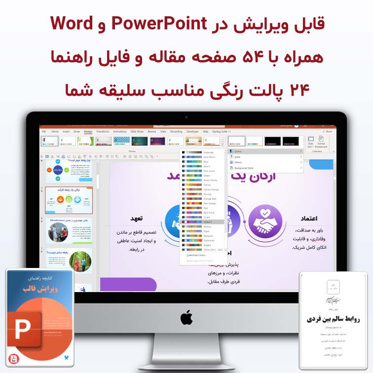 - قابلیت تغییر رنگ آسان: مهمتر از همه، رنگبندی کامل فایل بهسادگی و تنها با چند کلیک (با استفاده از ۲۴ پالت رنگی پیشفرض پاورپوینت) قابل تغییر و شخصیسازی است تا با سلیقه و برند شما کاملاً منطبق شود.