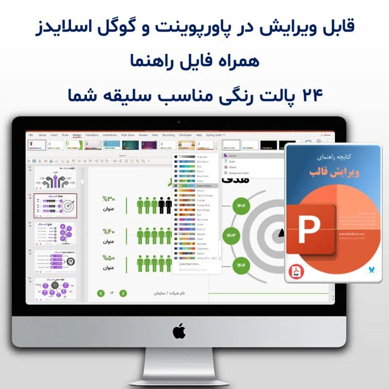 - تغییر رنگ با چند کلیک: این قالب به طور کامل با 24 پالت رنگی پیشفرض پاورپوینت سازگار است. تنها با چند کلیک از منوی Design، رنگبندی تمام اسلایدها را متناسب با هویت بصری برند خود تغییر دهید.