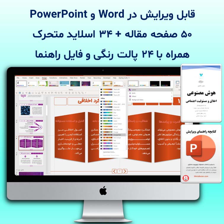 - تغییر رنگبندی آسان: امکان تغییر سریع رنگبندی کل پاورپوینت با استفاده از ۲۴ پالت رنگی پیشفرض آفیس، تنها با چند کلیک.