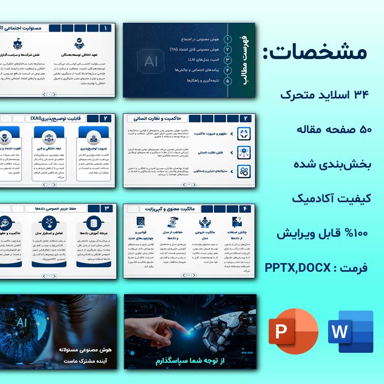 بسته کامل و جامع "هوش مصنوعی، اخلاق و مسئولیت اجتماعی" از متاباران، یک راهکار سریع، حرفهای و مقرونبهصرفه است تا بدون صرف وقت و هزینه بالا، به یک محتوای آکادمیک و بهروز دست یابید. این بسته شامل یک مقالهی ۵۰ صفحهای (Docx) و یک پاورپوینت متحرک (۳۴ اسلاید) است که کاملاً قابل ویرایش بوده و برای هر نوع ارائه یا تحقیق آماده است.