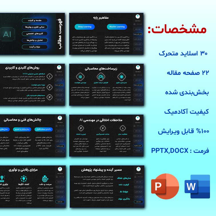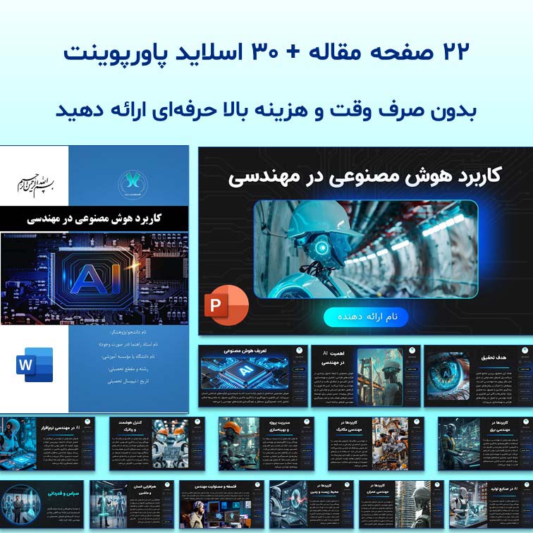 بسته آموزشی و تحقیقی «کاربرد هوش مصنوعی در مهندسی» یک محصول جامع و آماده برای دانشجویان، اساتید و علاقهمندان به فناوریهای نوین است. این پکیج شامل مقالهای 22 صفحهای و پاورپوینت حرفهای 30 اسلایدی با طراحی منودار، انیمیشن و جلوههای ویژه است. در این مجموعه، مفاهیم پایه و کاربردهای هوش مصنوعی در رشتههای مختلف مهندسی مانند برق، مکانیک، عمران و نرمافزار به زبانی ساده و علمی توضیح داده شده است. تنها با وارد کردن نام خود، از این فایلها برای ارائه دانشگاهی، تدریس یا تولید محتوای آموزشی استفاده کنید. این بسته آماده، راهی سریع و مقرونبهصرفه برای داشتن یک ارائه حرفهای در زمینه هوش مصنوعی است.برای دریافت، ابتدا در سایت متاباران ثبتنام کنید.روی دکمه «افزودن به سبد خرید» کلیک کنید و مراحل ثبت سفارش را کامل کنید.پس از ثبت سفارش، فایل محصول را از قسمت «دانلود فایلها» در پنل کاربری خود دریافت کنید. این فایل برای همیشه در پنل شما باقی میماند و در هر زمان قابل دانلود است.توضیحات بیشتر و ویدیوی این پاورپوینت آماده را در پایین صفحه مشاهده کنید.