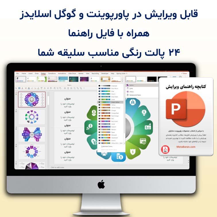 - قابلیت تغییر تم رنگی با ۲۴ پالت رنگی پیشفرض پاورپوینت تنها با چند کلیک