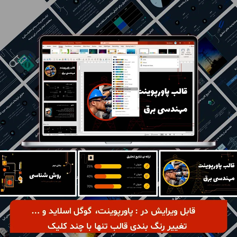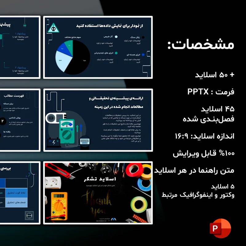 - طراحی نوآورانه و چشمنواز: این قالب با الهام از خلاقیت و نوآوری در مهندسی برق طراحیشده و ظاهری منحصربهفرد و چشمنواز به ارائه شما میبخشد.