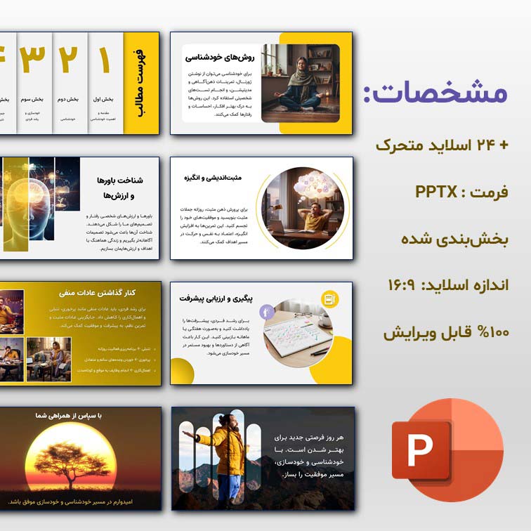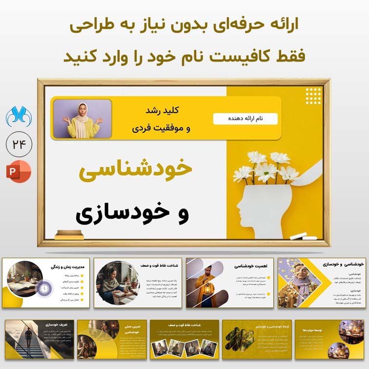 پاورپوینت آماده خودشناسی و خودسازی یک فایل حرفهای و کاملاً متحرک است که در ۲۴ اسلاید استاندارد آموزشی طراحی شده و بدون نیاز به تجربه طراحی، شما را برای ارائهای جذاب و اثرگذار آماده میکند. این فایل برای کلاس درس، ارائه دانشگاهی، کارگاههای رشد فردی، مشاوره و کوچینگ ایدهآل است.تمامی اسلایدها دارای انیمیشنهای هماهنگ، چیدمان حرفهای، فونت خوانا و طراحی مدرن هستند. کافیست نام خود را در اسلاید اول وارد کنید تا یک ارائه کامل و آماده داشته باشید.