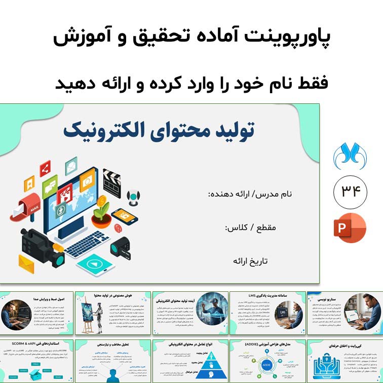 اگر برای کلاس درس، دانشگاه یا ارائهی آنلاین به یک پاورپوینت آماده و کاملاً استاندارد نیاز دارید، این فایل ۳۴ اسلایدی با موضوع تولید محتوای الکترونیک بهترین انتخاب شماست. با هزینهای بسیار کمتر از طراحی اختصاصی، یک فایل حرفهای، آماده ارائه و قابل ویرایش دریافت میکنید که فقط کافی است نام خود را در اسلاید اول وارد کنید!