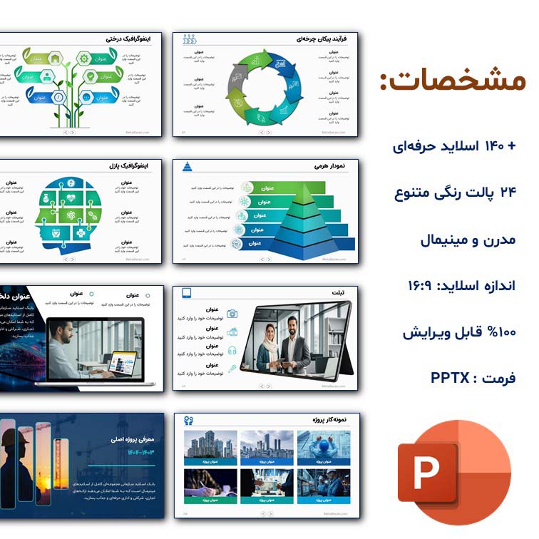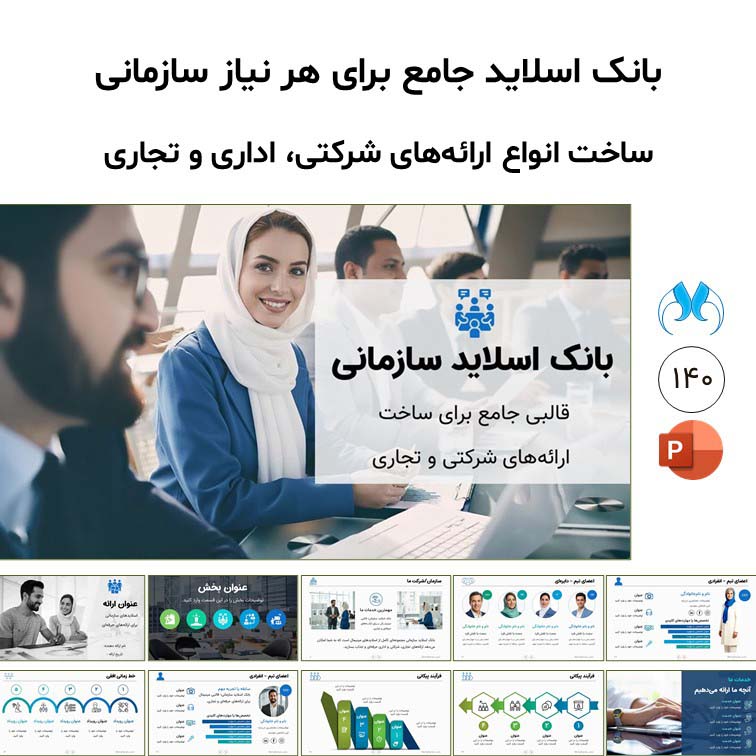 - 140 اسلاید متنوع: در اختیار داشتن یک بانک اسلاید کامل که دیگر نیازی به جستجو برای طرحهای دیگر نخواهید داشت.