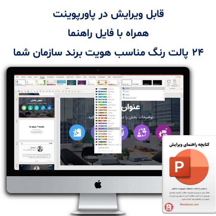 - قابلیت تغییر رنگ هوشمند: تم رنگی قالب تنها با چند کلیک قابل تغییر است و نیازی به تغییر تک به تک رنگ اسلایدها نیست.