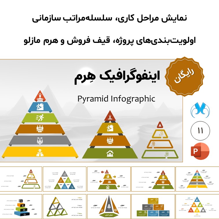 آیا برای نمایش مراحل کاری، سلسلهمراتب سازمانی یا اولویتبندیهای پروژه به دنبال راهی جذاب و بصری هستید؟ قالب پاورپوینت اینفوگرافیک هرم (Pyramid Infographic) که به صورت اختصاصی توسط تیم متاباران طراحی شده، ابزاری قدرتمند و کاملاً رایگان است. این محصول با داشتن ۱۱ اسلاید متنوع و خلاقانه، به شما کمک میکند تا دادههای پیچیده را در قالبی ساده، قابلفهم و حرفهای به مخاطبان خود ارائه دهید.