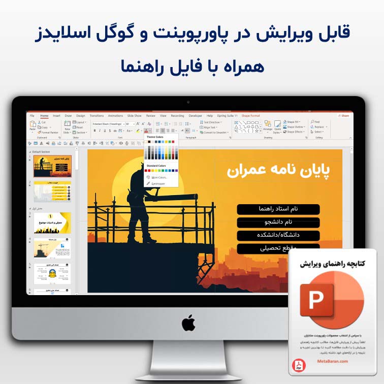 قالب آماده دفاع پایاننامه عمران متاباران، با طراحی مینیمال و مهندسی و استفاده از آیکونهای تخصصی عمران و تصاویر مرتبط با پروژههای ساختمانی، به شما کمک میکند تا در زمان کوتاه و با بالاترین کیفیت، یک ارائه تأثیرگذار و فراموشنشدنی داشته باشید.
