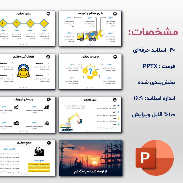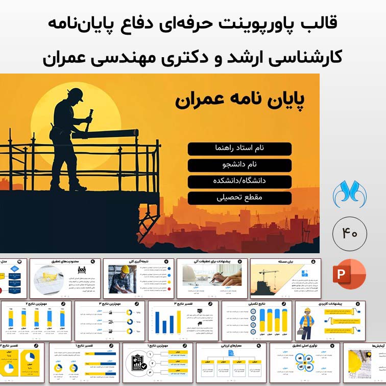 - ارائه سمینار و پروپوزال: از این قالب میتوانید برای ارائههای آکادمیک دیگر مانند سمینار کارشناسی ارشد، ارائه پروپوزال و گزارشهای تحقیقاتی مرتبط با رشته عمران و حوزههای مختلف آن استفاده کنید.