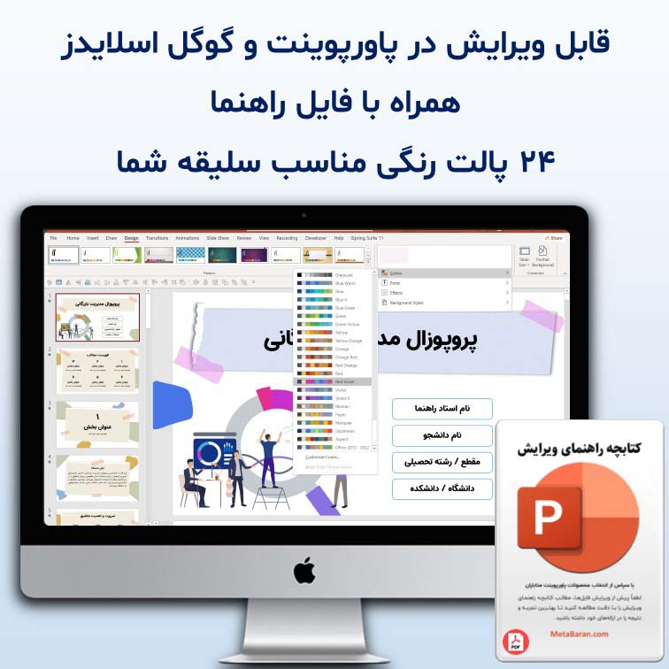 - قابلیت تغییر تم رنگی تنها با چند کلیک، مطابق با ۲۴ پالت رنگی پیشفرض پاورپوینت