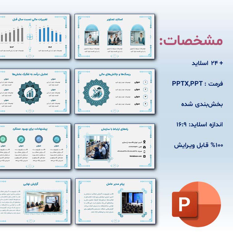 - اسلایدهای متنوع برای: KPI، بودجه، درآمد، هزینه، پروژهها، منابع انسانی، نمودارها و تحلیلها