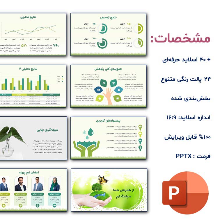 سبک طراحی این قالب مینیمال، مدرن و علمی است و از شلوغیهای بصری پرهیز شده تا تمرکز مخاطب روی محتوای ارائه حفظ شود. ترکیب رنگهای سبز (نماد رشد و طبیعت)، خاکی (کشاورزی و زمین) و آبی (آب و پایداری) بهصورت هدفمند انتخاب شده و هویت بصری کاملاً مرتبط با مهندسی کشاورزی ایجاد میکند. در عین حال، میتوانید تنها با چند کلیک، تم رنگی قالب را مطابق سلیقه خود تغییر دهید.