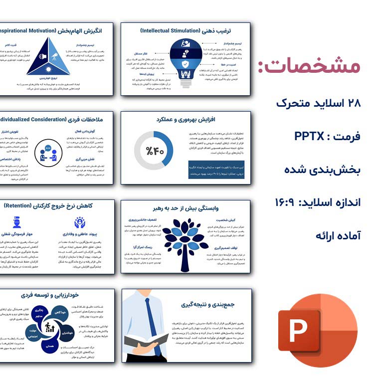 - معرفی مدل چهار رکن اصلی (Idealized Influence, Inspirational Motivation, Intellectual Stimulation, Individualized Consideration)