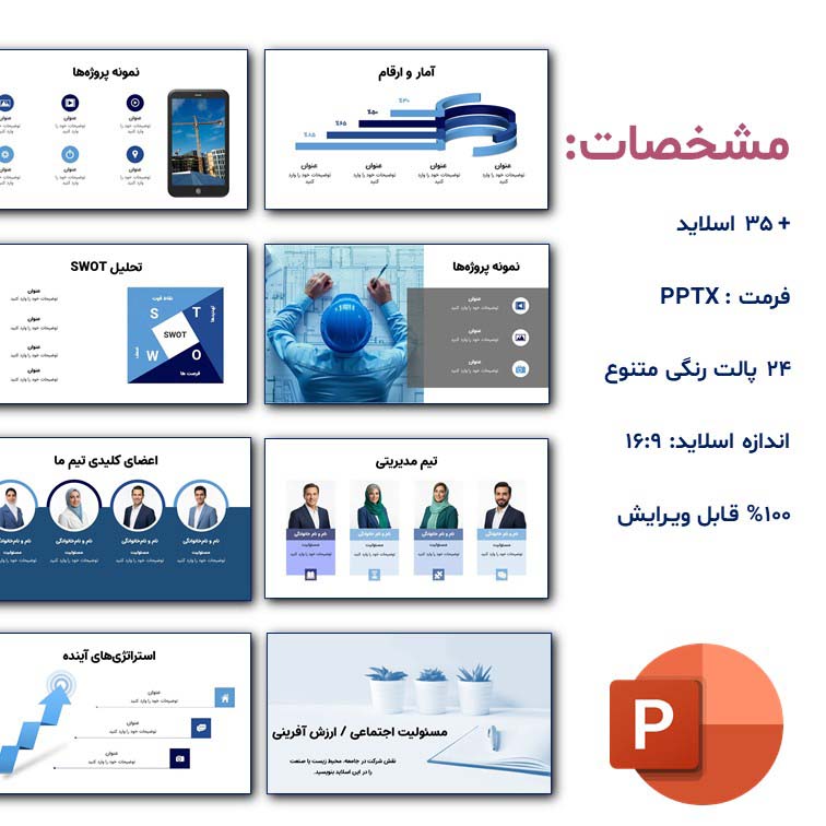 - شامل ۳۵ اسلاید استاندارد و کاربردی معرفی شرکت