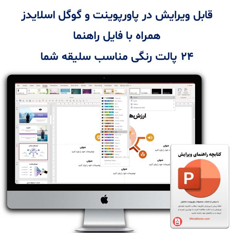 رنگبندی قالب بهصورت پیشفرض بر پایه ۲۴ پالت رنگی استاندارد پاورپوینت طراحی شده است تا بتوانید تنها با چند کلیک، رنگ قالب را متناسب با هویت بصری برند یا سازمان خود بدون بههمریختگی طراحی اسلایدها تغییر دهید.