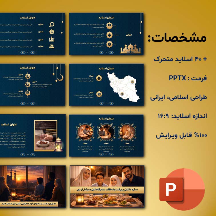 - شامل 36 اسلاید متنوع و کاملاً متحرک (Animated) ۴اسلاید پایانی شامل آیکونهای مرتبط با ماه مبارک رمضان (کاملاً قابل شخصیسازی)
