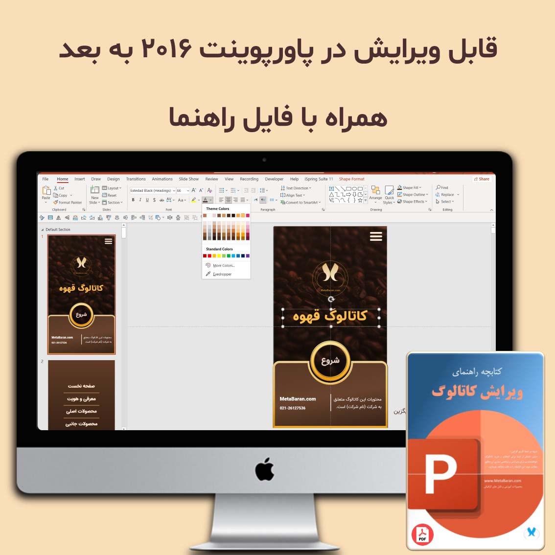اگر به دنبال راهی نوین برای معرفی محصولات قهوه، تجهیزات کافه یا رستری خود هستید، کاتالوگ الکترونیک قهوه متاباران بهترین انتخاب است. این محصول یک قالب آماده و قابل ویرایش در نرمافزار پاورپوینت است که با استانداردهای روز دنیا برای نمایش در گوشیهای هوشمند طراحی شده است.