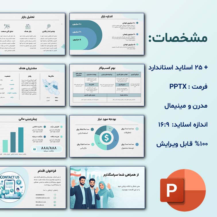 آیا برای ارائه ایدههای تجاری خود به دنبال یک ابزار بصری قدرتمند هستید؟ قالب پاورپوینت طرح کسب و کار متاباران با طراحی مدرن و ساختاری استاندارد، تمام نیازهای شما را برای یک ارائه بیپنقص در جلسات دفاع، جذب سرمایهگذار و جلسات شرکتی برطرف میکند. این قالب در ۲۵ اسلاید تخصصی طراحی شده و به شما کمک میکند تا بیزینس پلن (Business Plan) خود را با اعتمادبهنفس کامل ارائه دهید.