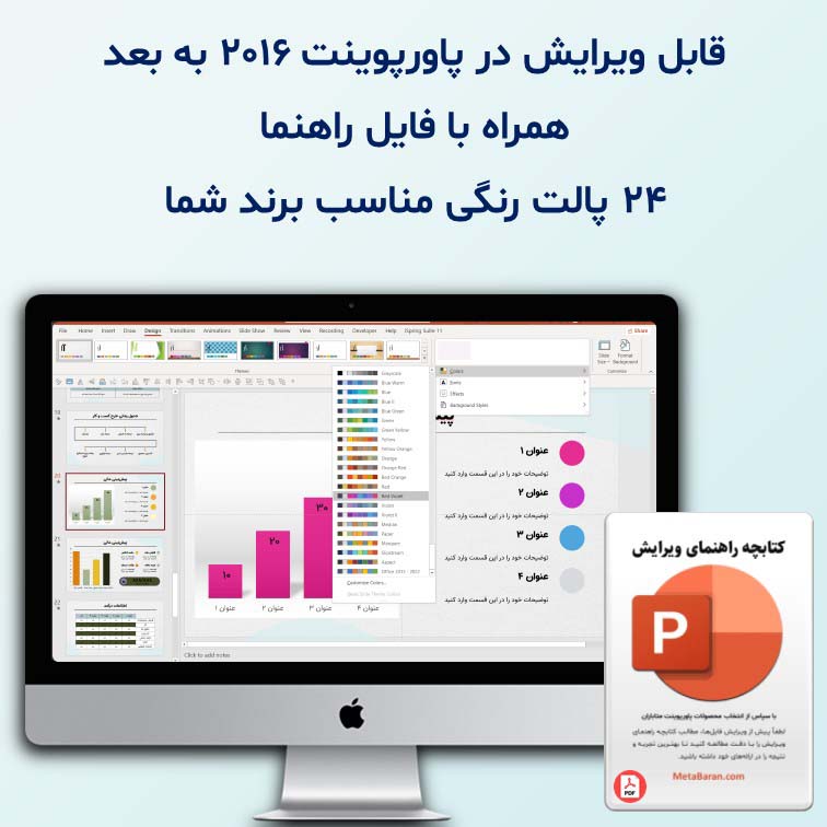- شخصیسازی نامحدود: قابلیت تغییر تم رنگی با استفاده از ۲۴ پالت رنگی پیشفرض پاورپوینت تنها با چند کلیک.