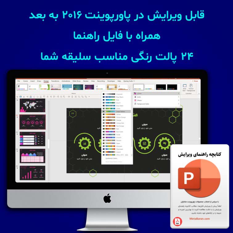 تم رنگی قالب با استفاده از 24 پالت رنگی آماده پاورپوینت تنها با چند کلیک قابل تغییر است؛ بنابراین میتوانید آن را متناسب با سلیقه یا هویت بصری برند خود شخصیسازی کنید.