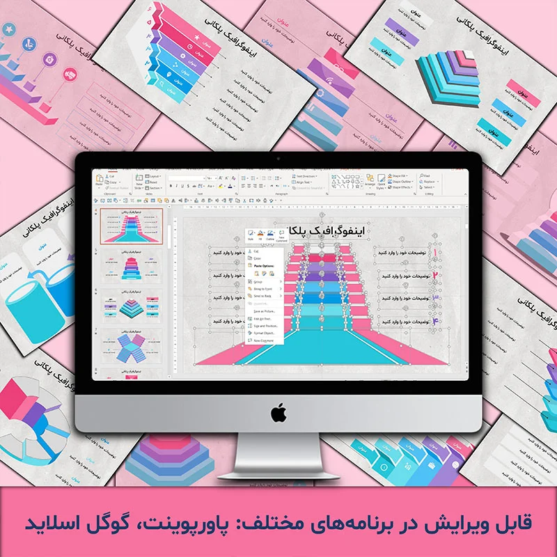 - طراحی خلاقانه: 30 اسلاید اینفوگرافیک با طرحهای سه بعدی، ایزومتریک، مسطح، پر شده و خطوط زمانی برای نمایش مراحل و سطوح مختلف.