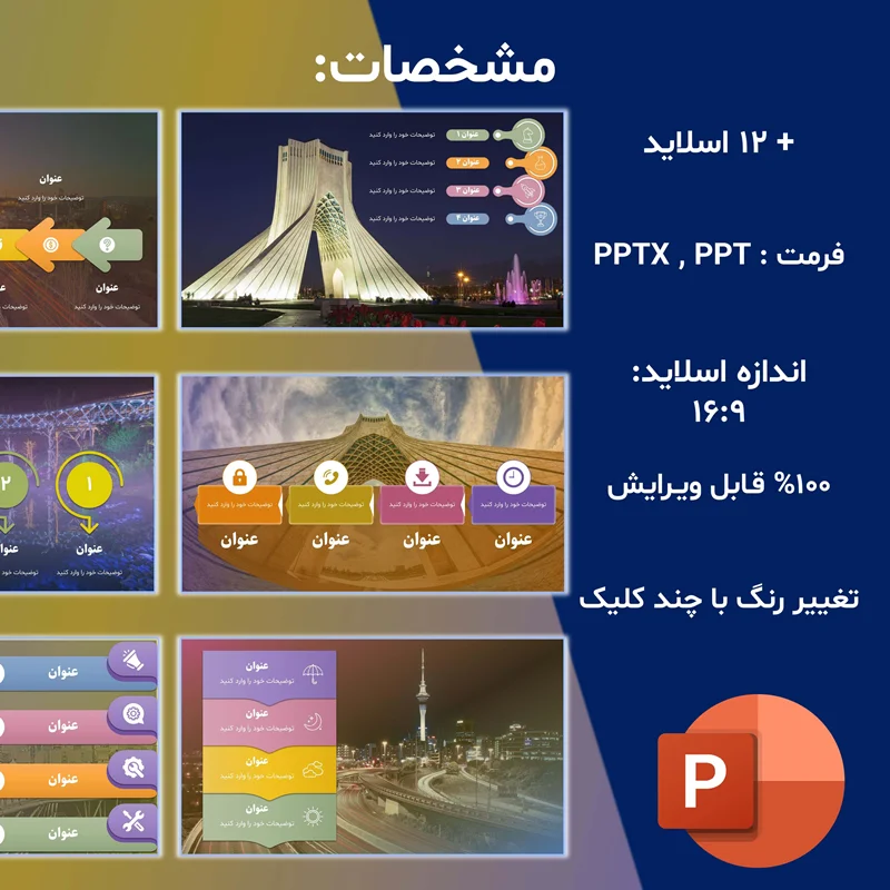 طراحی این قالب با الهام از معماری مدرن و نمادهای شهری تهران، تلفیقی از زیبایی و سادگی است. استفاده از رنگهای شاد و زنده، فونتهای خوانا و انیمیشنهای روان، باعث جذابیت بیشتر این قالب شده است.