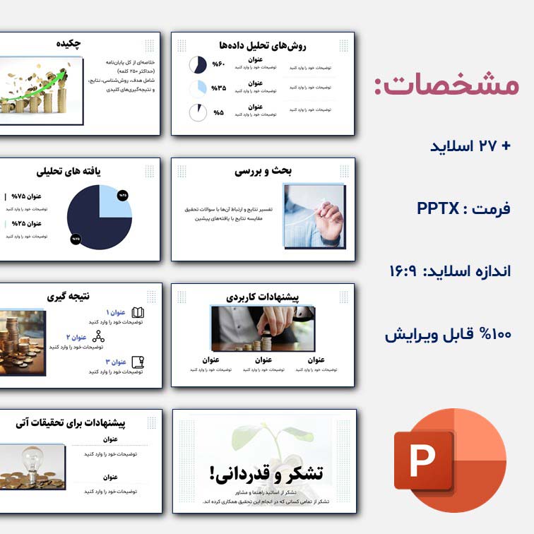 - 27 اسلاید کاربردی: شامل تمام اسلایدهای مورد نیاز برای یک دفاع کامل و جامع.